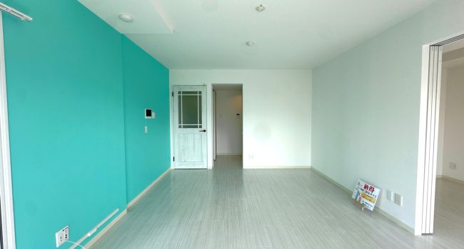 リビングは、ティファニーブルーのアクセントクロスが印象的な洗練された空間。