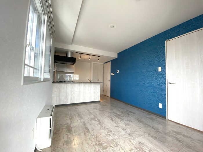 リビングは目を惹くブルーのアクセントクロスが印象的で、ナチュラルグレーのフロアと調和し、落ち着きと個性を感じるデザインです✨