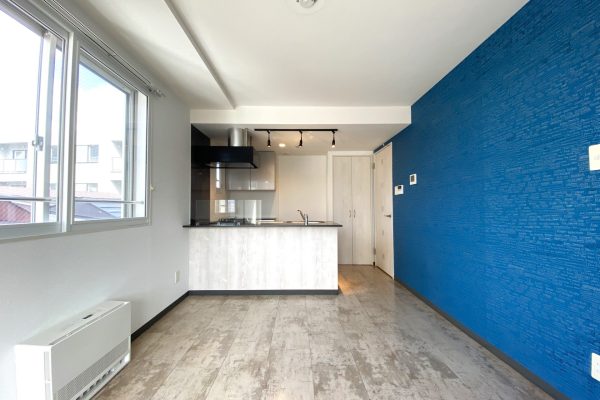 リビングは目を惹くブルーのアクセントクロスが印象的で、ナチュラルグレーのフロアと調和し、落ち着きと個性を感じるデザインです✨