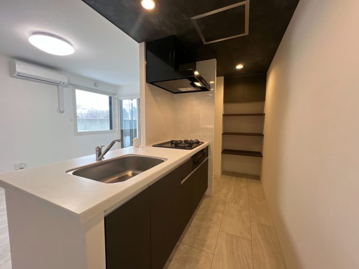 食品ストックや調理家電、食器類などをまとめて収納でき、